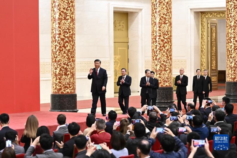 在中國共產(chǎn)黨第二十屆中央委員會第一次全體會議上當選的中共中央總書記習近平和中共中央政治局常委李強、趙樂際、王滬寧、蔡奇、丁薛祥、李希,23日中午在人民大會堂同采訪中共二十大的中外記者親切見面。