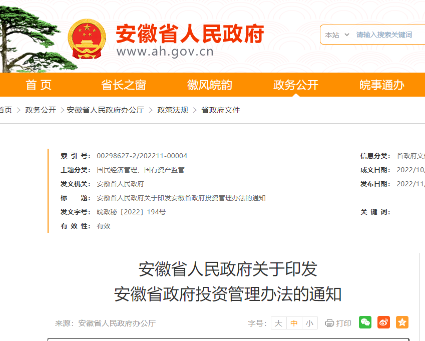 11月10日,安徽省政府網(wǎng)站發(fā)布《安徽省人民政府關(guān)于印發(fā)安徽省政府投資管理辦法的通知》,印發(fā)《安徽省政府投資管理辦法》。
